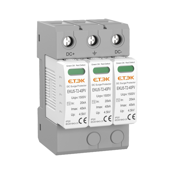 EKU5-T2直流電涌保護(hù)器適用于額定電壓DC600?1500V太陽(yáng)能光伏發(fā)電系統(tǒng)或其他直流電源系統(tǒng)的防雷及過(guò)電壓保護(hù)。滿(mǎn)足II類(lèi)(8/20μs波形)電涌保護(hù)器(SPD)試驗(yàn),用于抑制瞬態(tài)過(guò)電壓低于設(shè)備耐沖擊過(guò)電壓,泄放電涌能量,從而保護(hù)系統(tǒng)電路及設(shè)備,針對(duì)光伏系統(tǒng)設(shè)備保護(hù)設(shè)計(jì)U、Y型結(jié)構(gòu)。